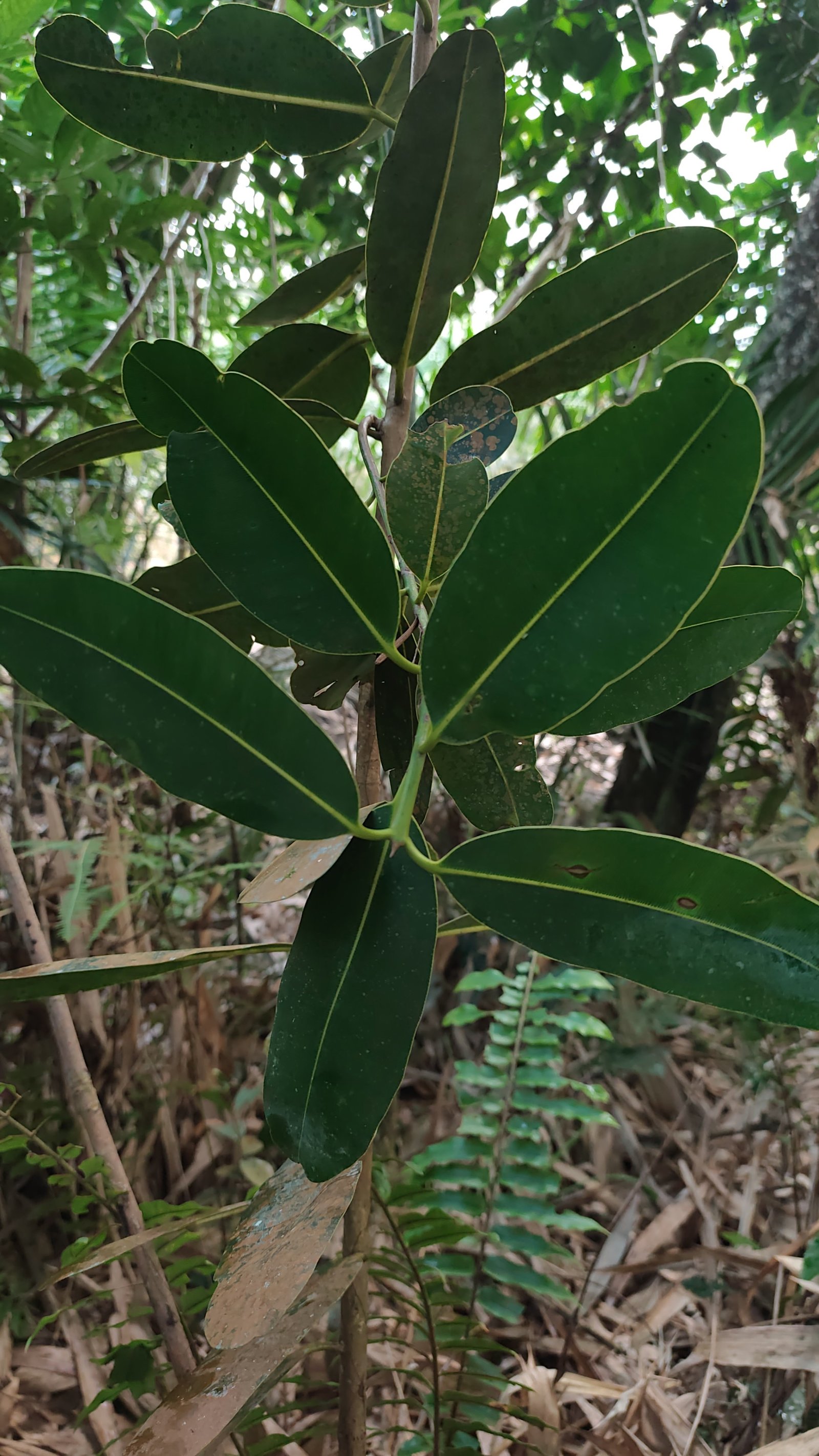 Tipe daun: Tunggal, tersusun secara berhadapan (oppositus), bertangkai pendek (petiolatus). Helaian daun: Bentuk elips lebar sampai oval (obovatus–ellipticus), dengan ujung membulat atau tumpul (obtusus), dan pangkal menyempit (cuneatus). Tepi daun: Rata (integra). Permukaan: Mengkilap dan tebal seperti kulit (kutikularis), berwarna hijau tua di atas dan lebih pucat di bawah. Pertulangan: Paralel–pinnatinervis, tulang daun utama terlihat jelas dan sejajar, seperti garis halus menyilang diagonal. Ciri khas: Daun mengandung saluran resin di dalam mesofil yang menghasilkan eksudat aromatik.