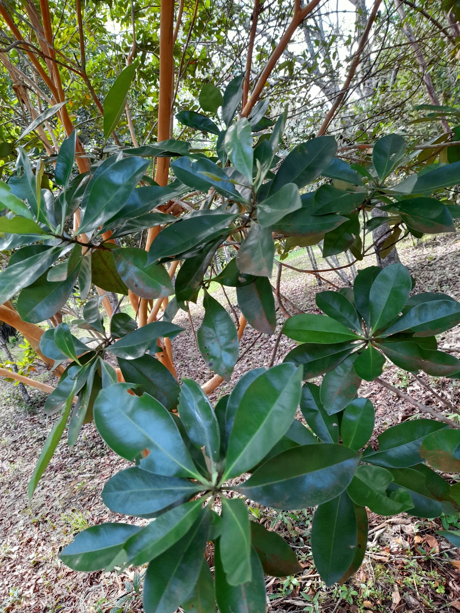 Susunan: Spiral (alternate). Bentuk: Lanset (lanceolate) hingga eliptik memanjang kuran daun:Panjang: 6 – 13 cm, Lebar: 1,5 – 4 cm. Warna:permukaan atas hijau tua mengilap, permukaan bawah hijau keabu-abuan. Tepi daun rata, ujung runcing, pangkal menyempit. Tekstur agak kaku, dengan tulang daun menyirip yang menonjol
